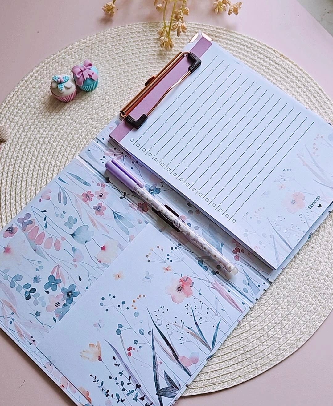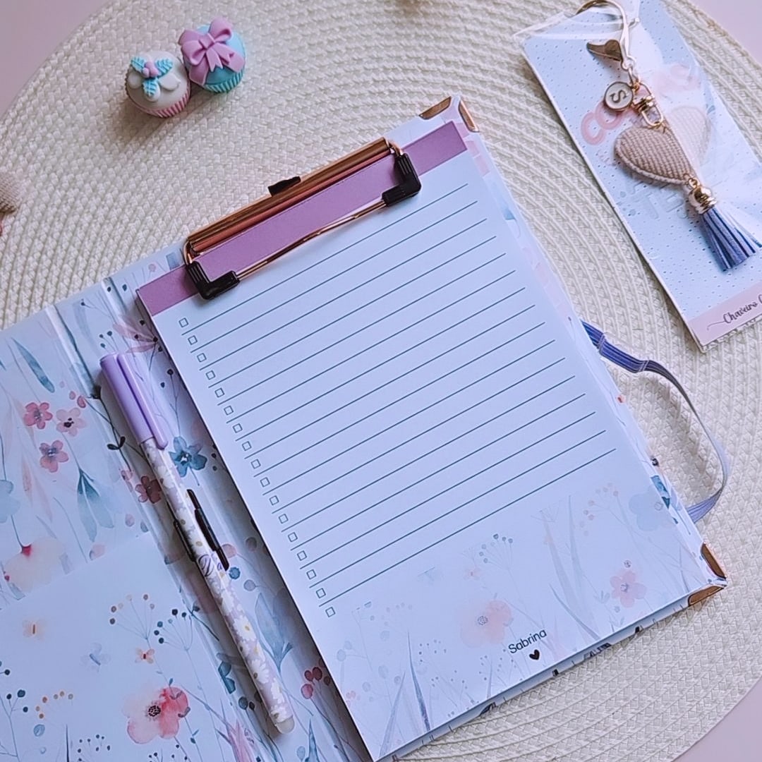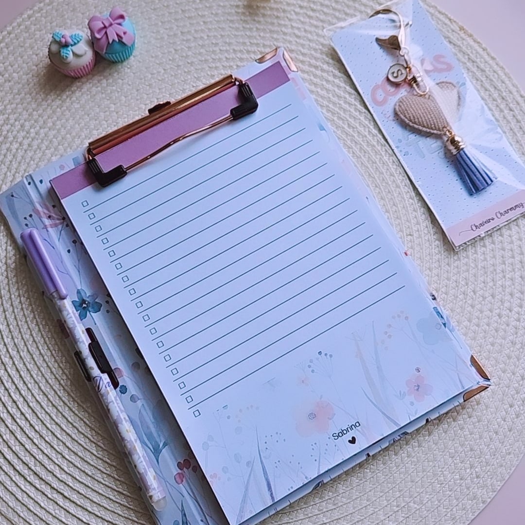 A prancheta é feito com papelão rígido, como capa dura de caderno