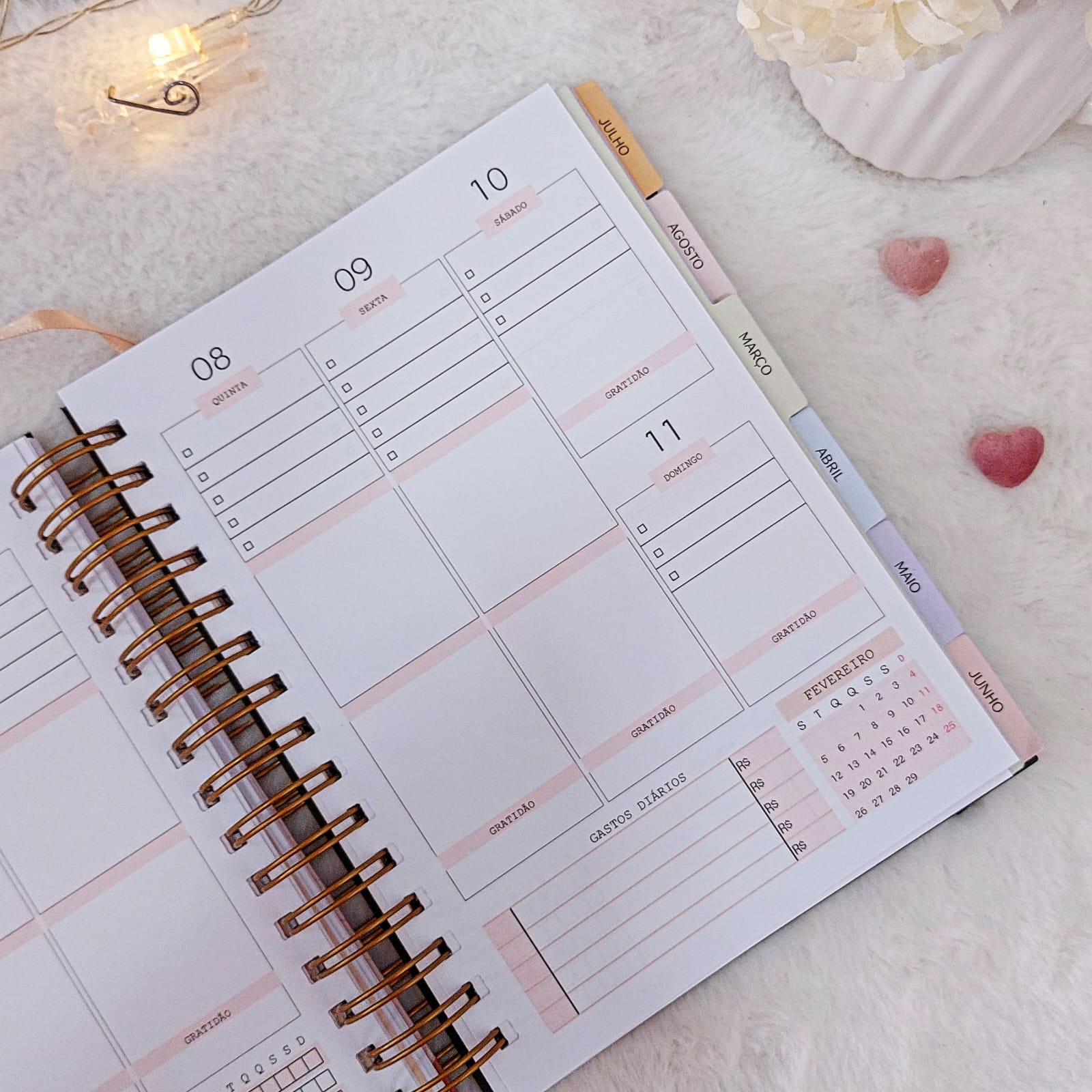 – Planejamento semanal com datas e espaços para ticar tarefas concluídas, anotar lembretes, e duas principais atividades de cada dia. Os dias são separados com 3 partes (exceto sábado e domingo) para dividir como achar melhor (manhã, tarde e noite | pessoal, estudo e trabalho). Calendário do mês vigente e controle de hábitos.